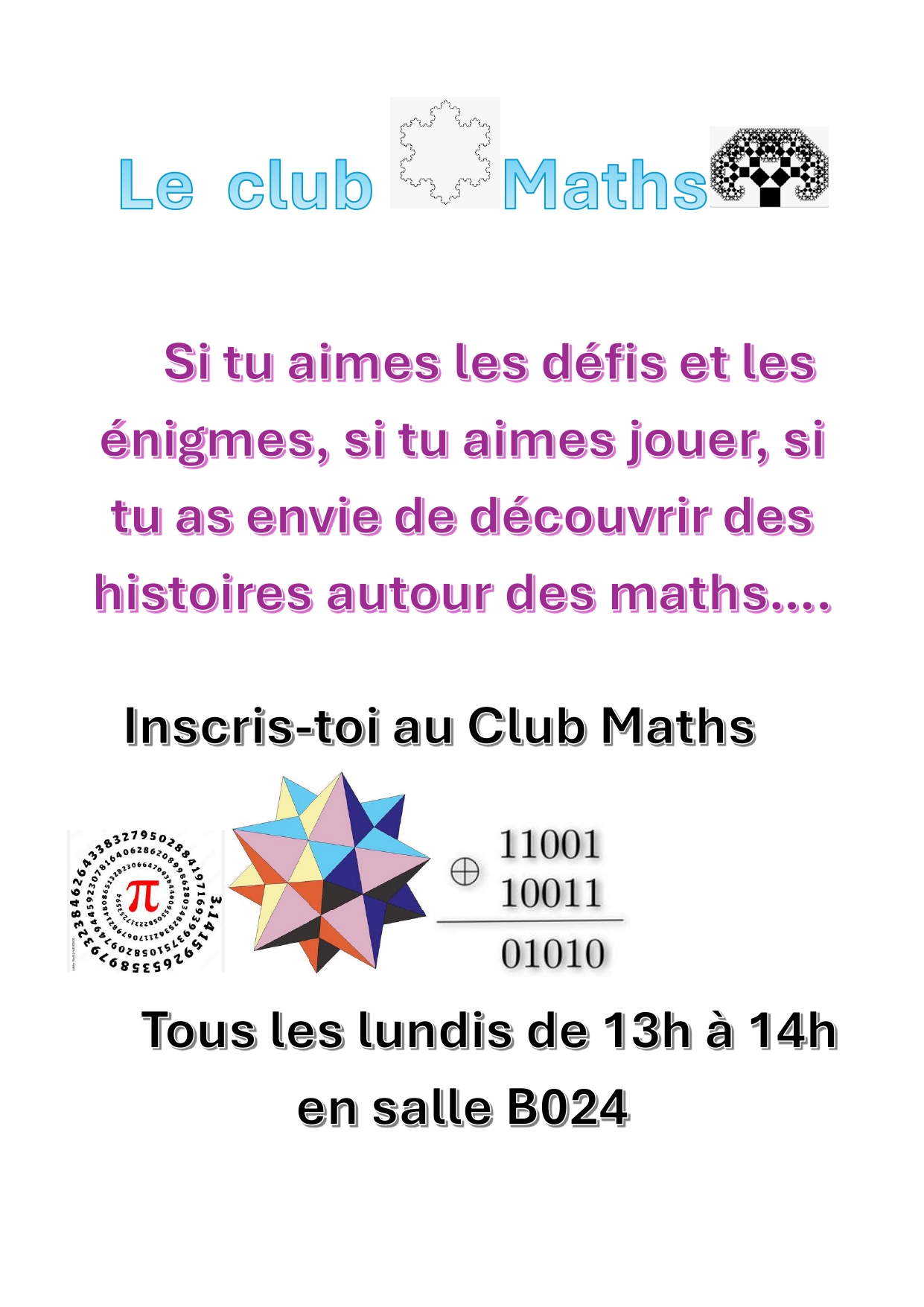 Tous les lundis de 13h à 14h venez nous rejoindre pour des activités ludiques en mathématiques.