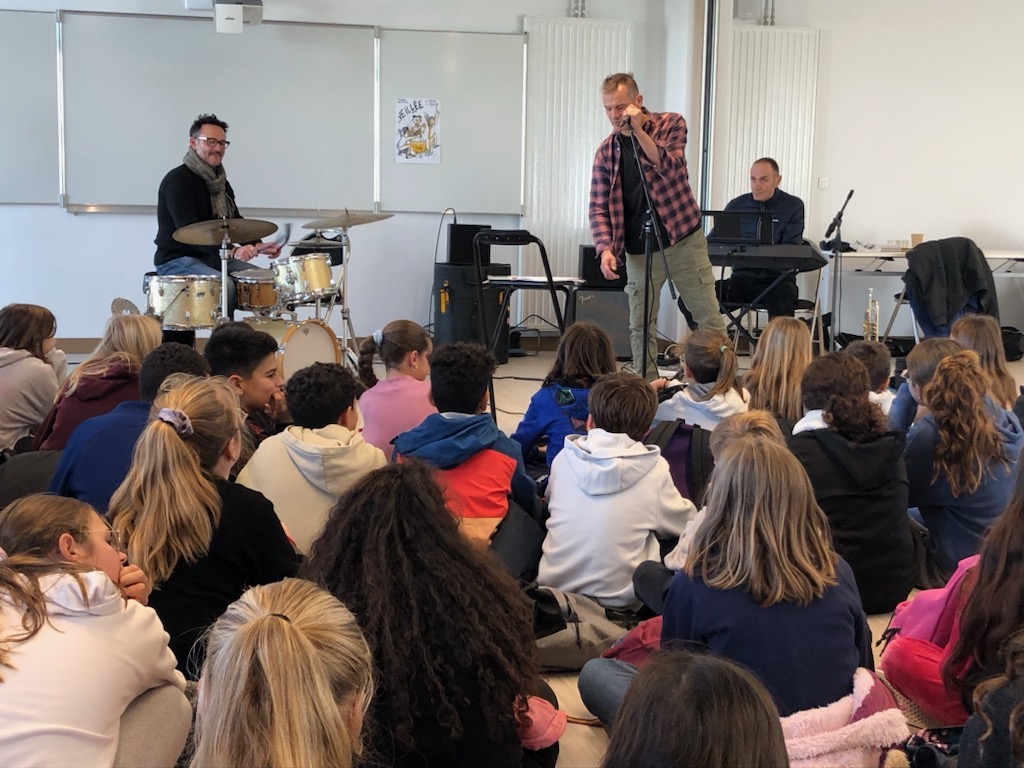 Le 28 novembre 2025 : Partage musical d'histoires de territoires avec la compagnie Les Locataires et tous les élèves de 6èmes. Un instant de bonheur partagé.
